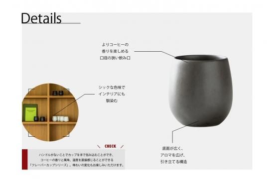フレーバーカップシリーズは、ハンドルがないことでカップを手で包みこむことができ、コーヒーの香りや風味、温度を直接感じることができます。