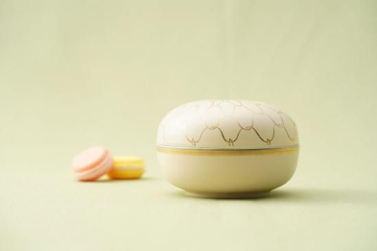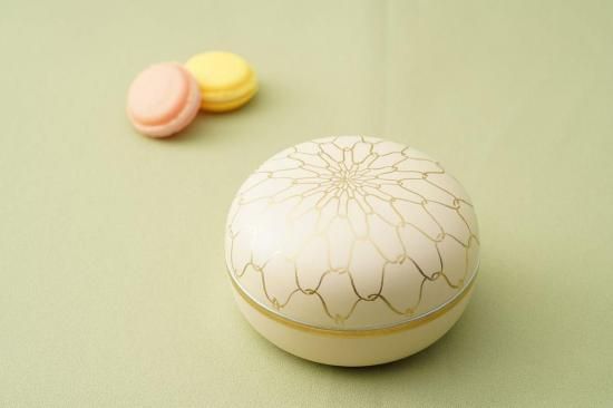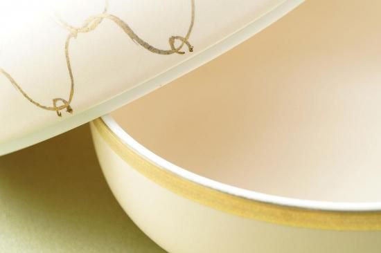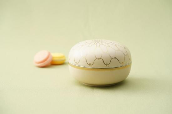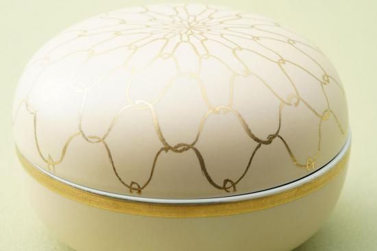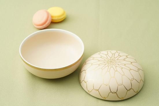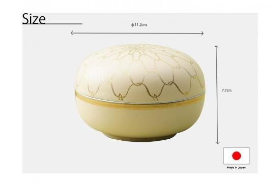 この網丸蓋物は、エレガントで上品なアイボリーカラーのベースに、繊細な金彩のデザインが施されています。