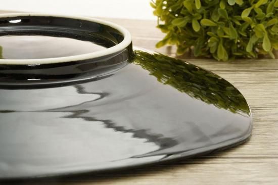 皿の表面に、撥水成分を調合した絵の具で十草の柄を印刷した後、皿全体に釉薬を施しています。