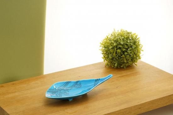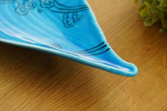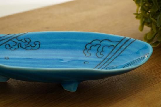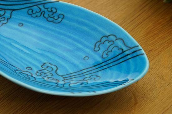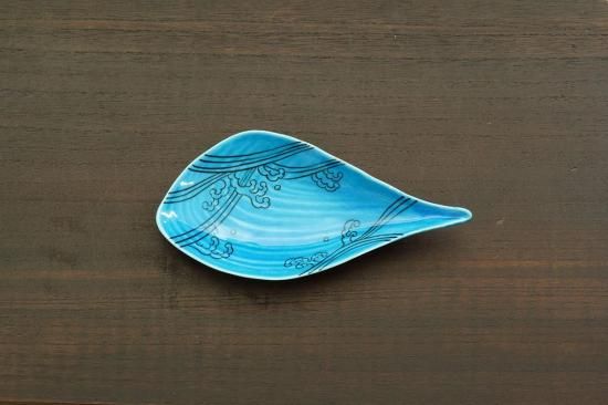 鮮やかな浅黄(あさぎ)色に美しい波頭(はとう)の模様が描かれた、小さめサイズの上品な皿です。