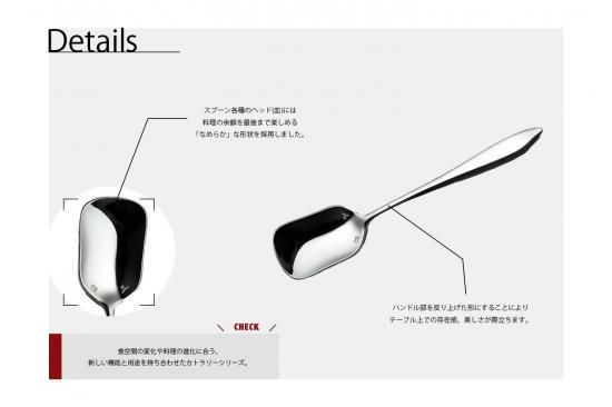 機能性とデザインの融合により生み出された新しい形で、スプーン各種のヘッド(皿)には料理の余韻を最後まで楽しめる「なめらか」な形状を採用しました。