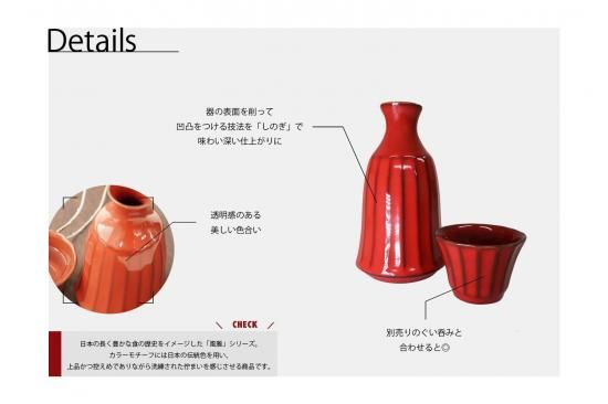 同シリーズのぐい呑みと揃えると、誰かと二人きりの晩酌にゆったりとしたひと時を過ごせます。