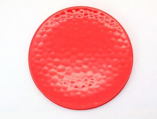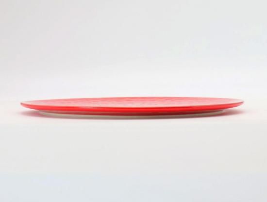 鮮やかなレッドに生地の掘り込みが印象的なフラットなプレート。