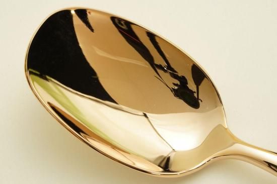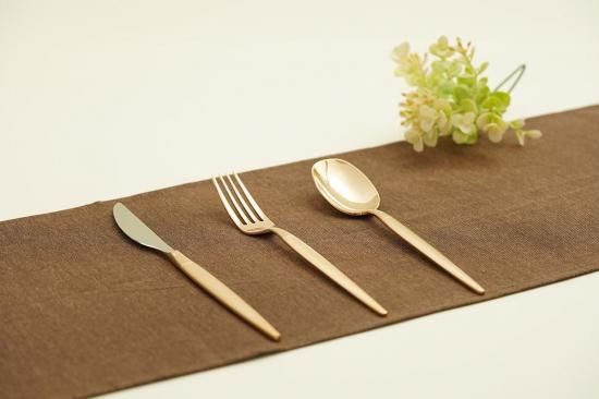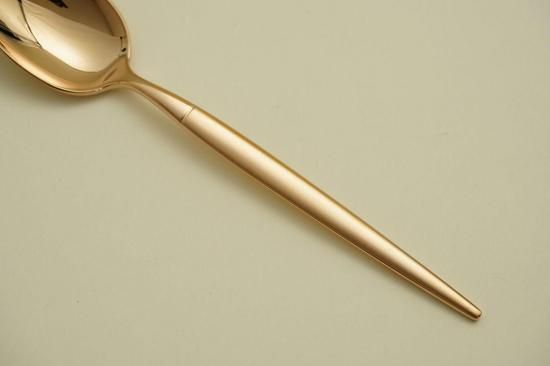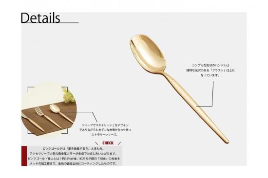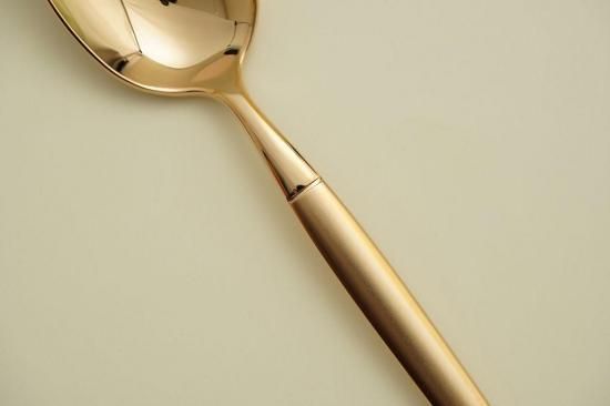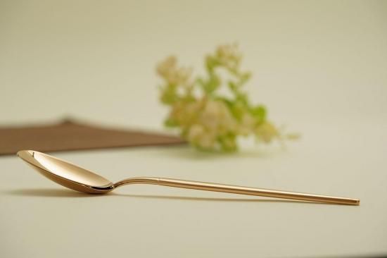 レストランやカフェなどの空間にも適応する美しいフォルムに、ピンクゴールドの輝きを放つカトラリーです。