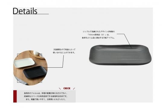 シンプルで洗練されたデザインが特徴の「18.4cm長角皿(小)」は、食卓をより上品に演出する万能アイテム。