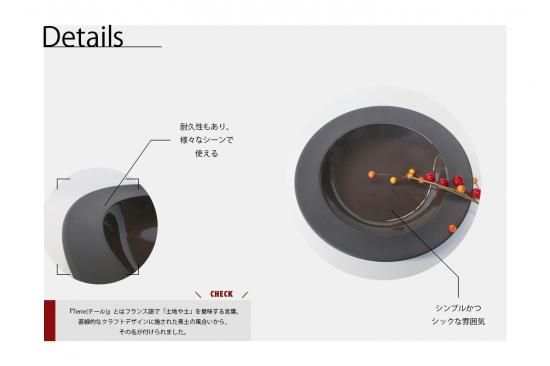 近年、業務用食器には強度が求められ、白色の土で焼き絞められた無垢の食器が一般的になっていますが、Terreは業務用でも耐えうる強度を持つ新素材の黒土を使用。