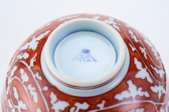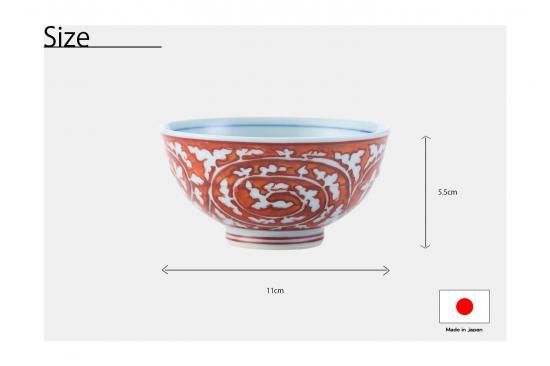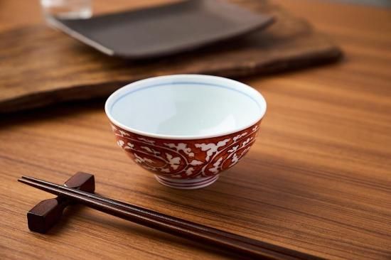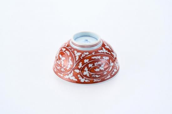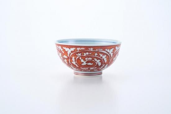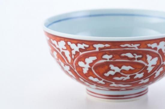 品格溢れる渦唐草文様と目を惹く朱色の絵具が上品な佇まいの有田焼の飯碗。