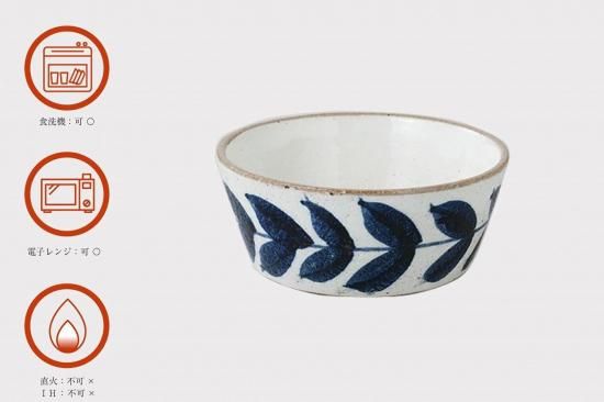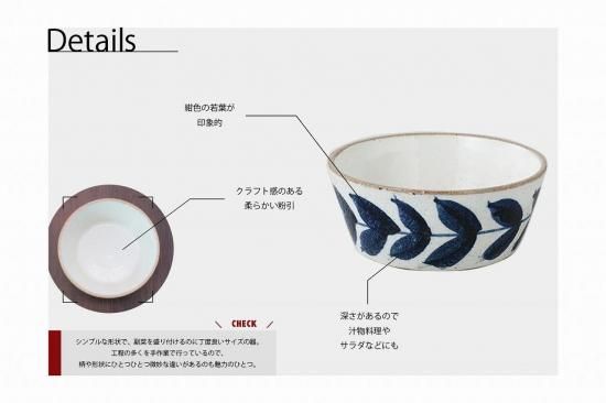 粉引釉の上に藍色で描かれたシンプルな若葉のデザインがおしゃれなシリーズです。