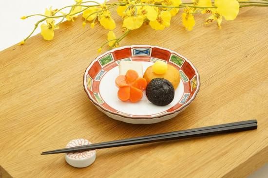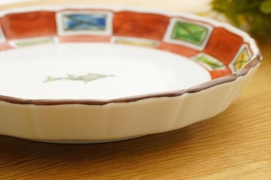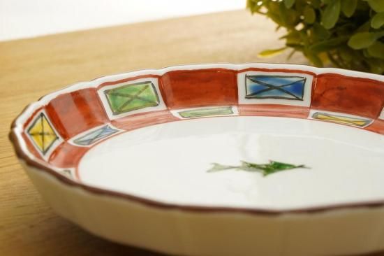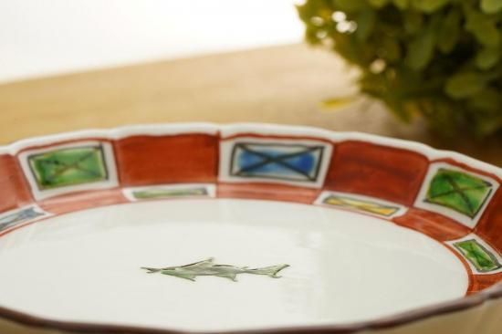 赤・青・緑・黄の上絵4色で渕面を彩る市松模様が華やかに盛り付けた食材やお料理を引き立てます。