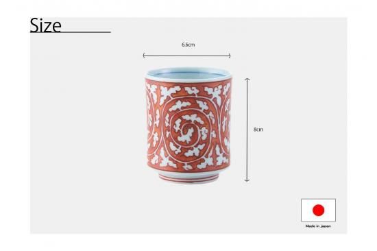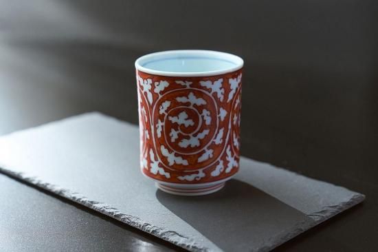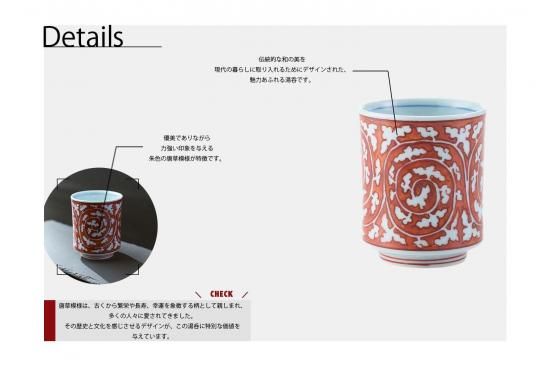 この湯呑は、優美でありながら力強い印象を与える朱色の唐草模様が特徴です。