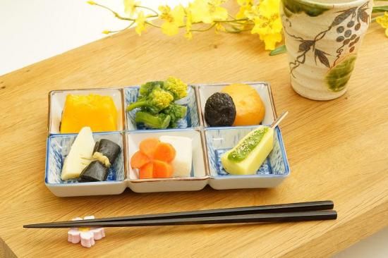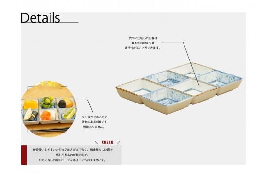 六つに仕切られた器は様々な料理を少量盛り付けることができます。
