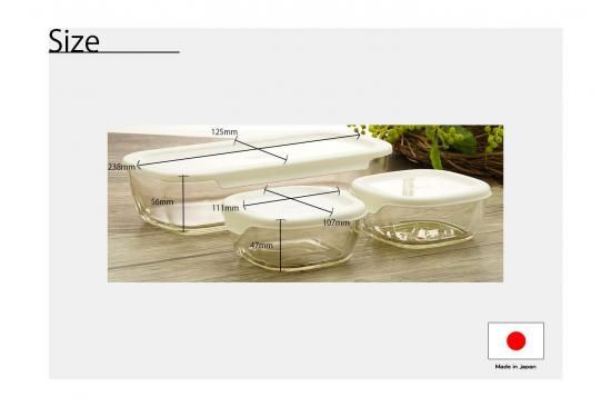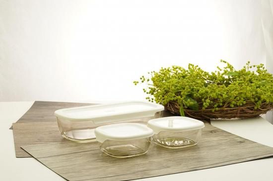 スタッキング可能で冷蔵庫収納しやすい角型の耐熱ガラスコンテナセット。
