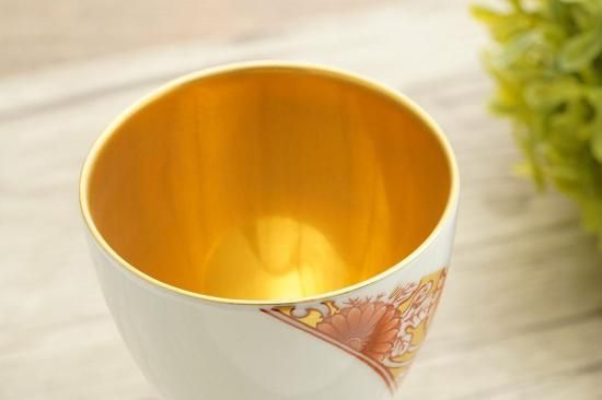 表面に描かれた見事な絵付けと、グラス内側に彩られた金色のコントラストが美しい、有田焼の豪華なグラスです。