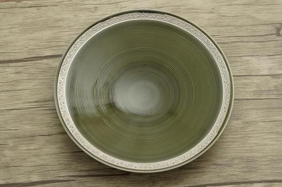 織部にプラチナという珍しい組み合わせのお皿は、使うほどに心を奪われる美しさを放ちます。
