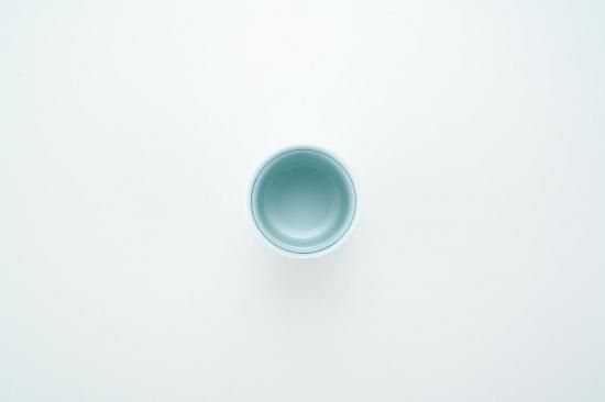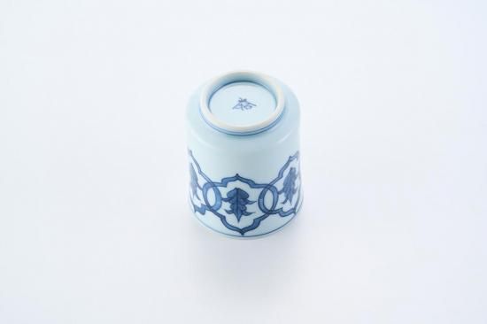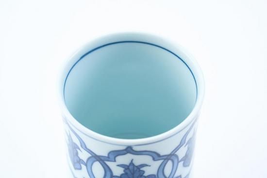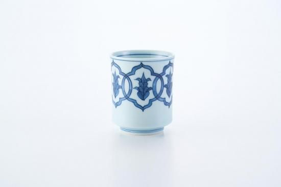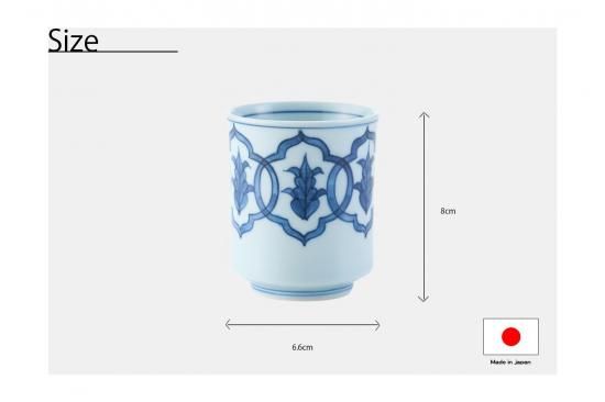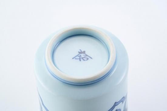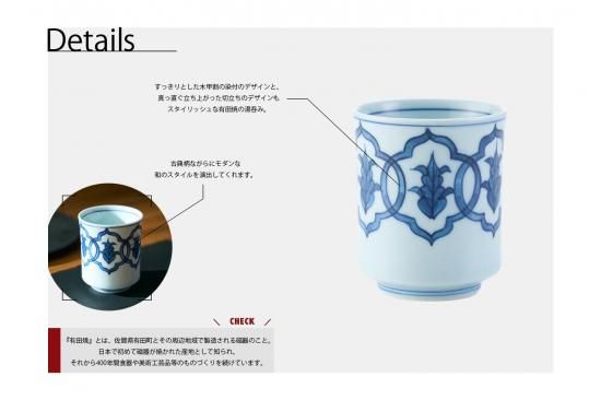 すっきりとした木甲割の染付のデザインと、真っ直ぐ立ち上がった切立ちのデザインもスタイリッシュな有田焼の湯呑み。