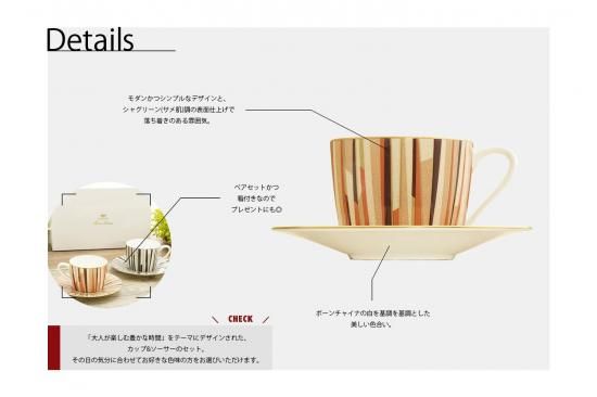 「大人が楽しむ豊かな時間」をテーマにデザインされた、カップ&ソーサーのセット。