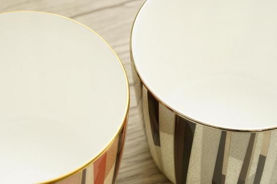 ボーンチャイナの白を基調に、モダンかつシンプルなデザインと、シャグリーン(サメ肌)調の表面仕上げで落ち着きのある雰囲気に仕上げています。