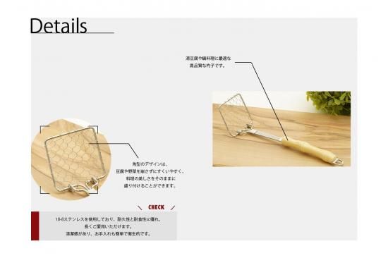 角型のデザインは、豆腐や野菜を崩さずにすくいやすく、料理の美しさをそのままに盛り付けることができます。