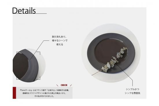 近年、業務用食器には強度が求められ、白色の土で焼き絞められた無垢の食器が一般的になっていますが、Terreは業務用でも耐えうる強度を持つ新素材の黒土を使用。