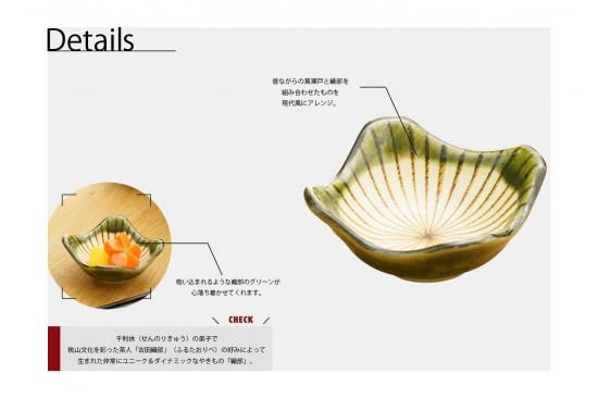 茶の湯の器であった織部焼は、江戸時代後期に瀬戸で初めて日常の器として生産されるようになり今では幅広く食卓用の器として浸透してきました。