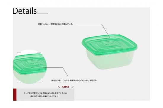 【ラップ等が不要であり本容器は繰り返し使用できるため使い捨て包材の削減につながりエコである。】