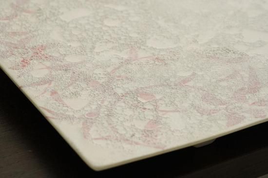 泡のような模様と赤みがかった花がテーブルコーディネイトを華やかに演出いたします。