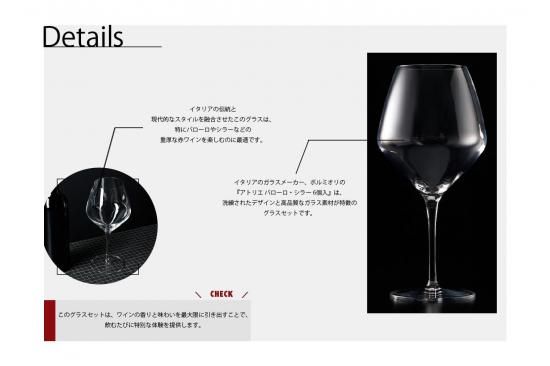 イタリアの伝統と現代的なスタイルを融合させたこのグラスは、特にバローロやシラーなどの重厚な赤ワインを楽しむのに最適です。
