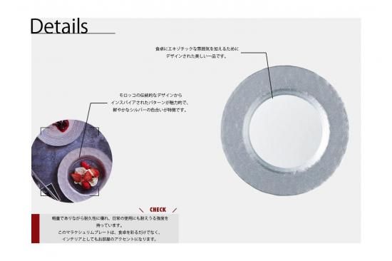 このプレートは、モロッコの伝統的なデザインからインスパイアされたパターンが魅力的で、鮮やかなシルバーの色合いが特徴です。