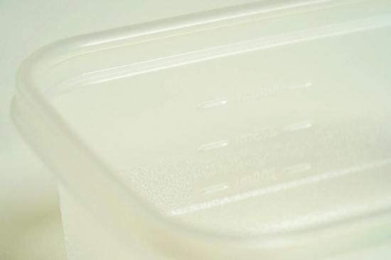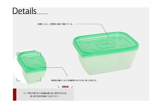 【ラップ等が不要であり本容器は繰り返し使用できるため使い捨て包材の削減につながりエコである。】