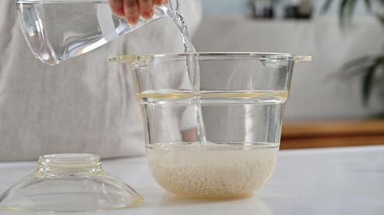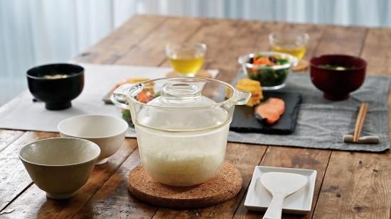 「中身が見える」耐熱ガラス製電子レンジ用炊飯器。