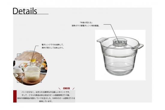 長年の炊飯商品の設計ノウハウを生かした、HARIOのオール耐熱ガラスを使用しています。