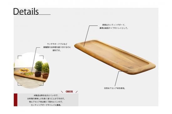 特にアカシア材は軽くて割れにくいので、カッティングボードやトレイに最適。