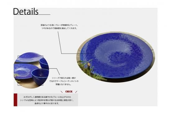 みずみずしく透明感のある鮮やかなブルーに仕上げられたシンプルな色味により和洋中を問わず様々なお料理と相性が良く、食卓をより華やかに彩ります。