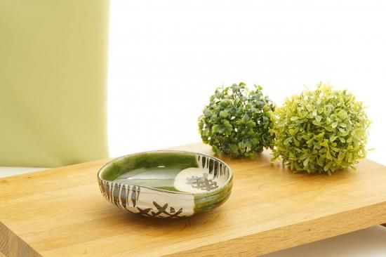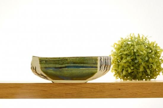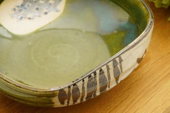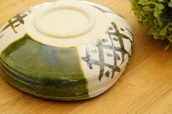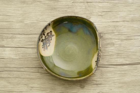 歪な形、派手な文様、味わい深い暗緑色といった斬新なスタイルが特徴的な器。