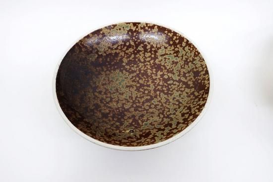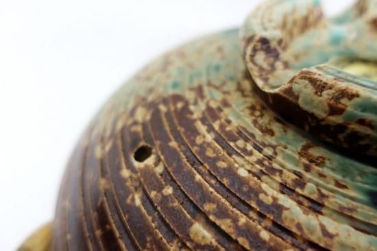 土のようなアメ色に、森林のようなイメージの織部釉がアクセントとなり、自然を思わせるようなあたたかみを表現しています。