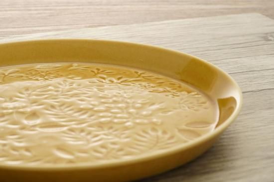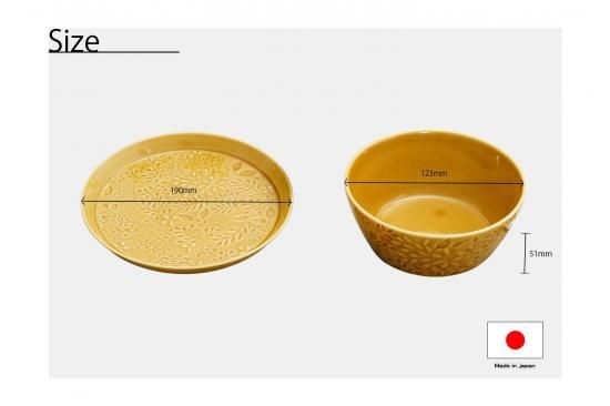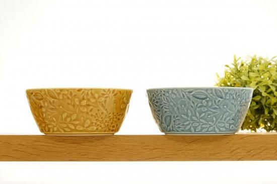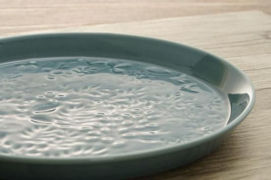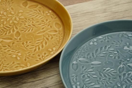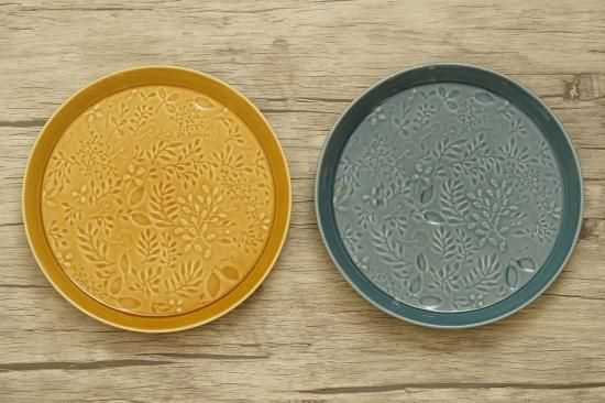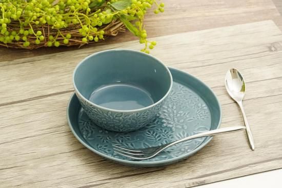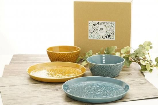 美しいリーフモチーフがエンボス加工されたプレートとボウルが2色ずつ含まれており、家庭での様々なシーンを彩ります。