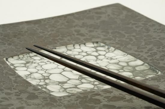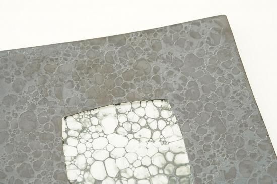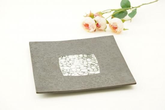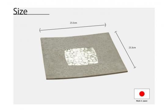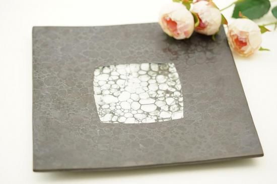 23.3cm×23.3cm×1.5cmとコンパクトながらも存在感のあるサイズ感のこのお皿は、黒い砂釉が美しく施されおり、その表面には月のような神秘的な模様が映し出されています。