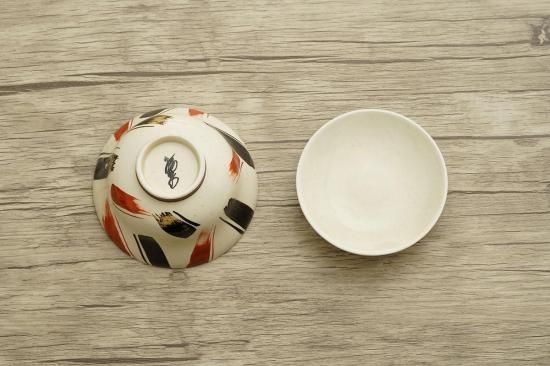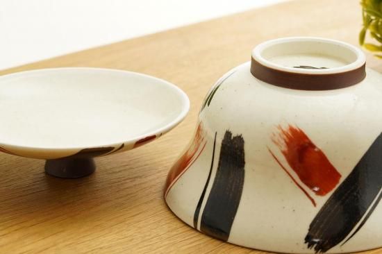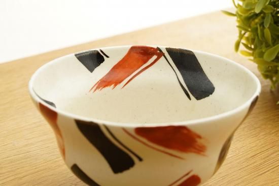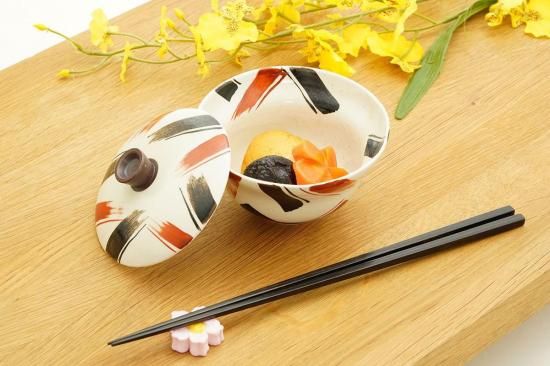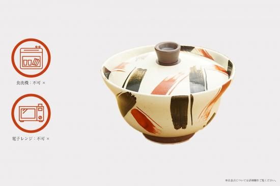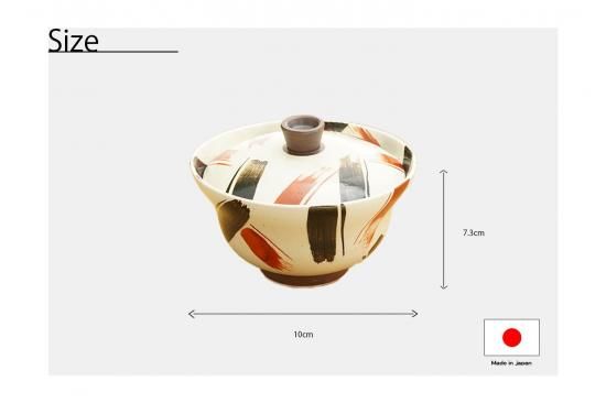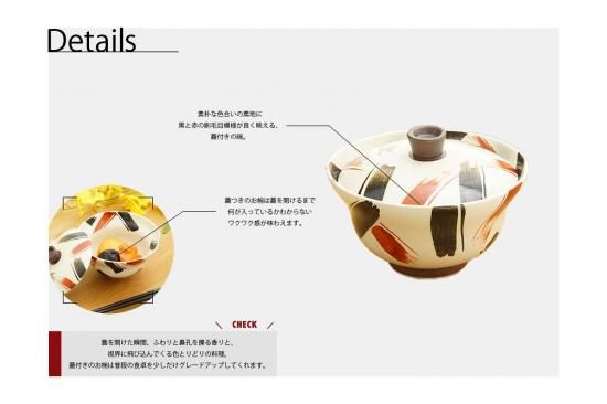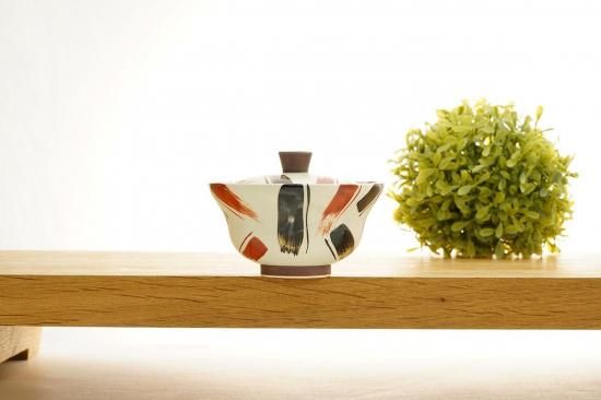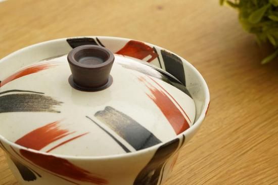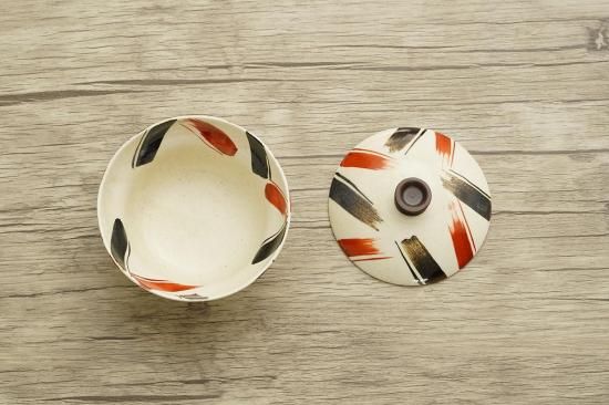 素朴な色合いの素地に黒と赤の刷毛目模様が良く映える、蓋付きの碗。