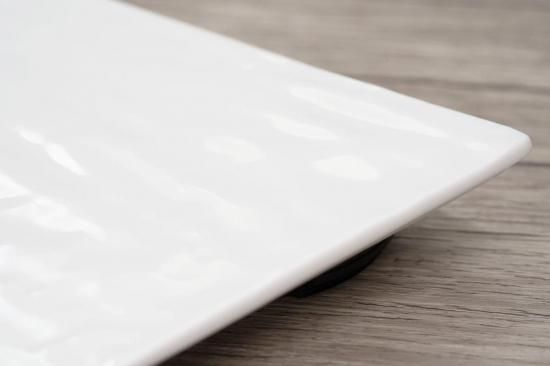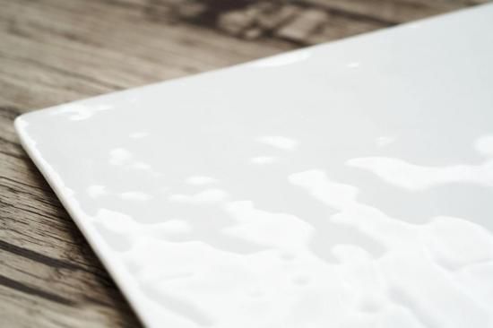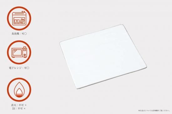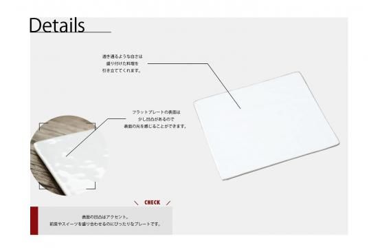 透き通るような白さのフラットな角皿はテーブルコーディネイトの邪魔にならず、食材を引き立ててくれます。