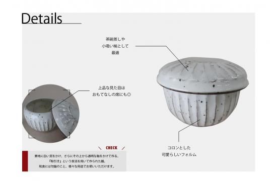 素朴な粉引に荒々しく削ぎ目をつけたデザインが個性ある、茶碗蒸しや蒸し物料理に最適の蒸し碗です。