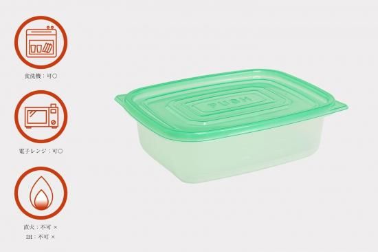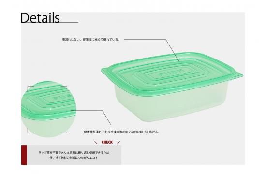 【ラップ等が不要であり本容器は繰り返し使用できるため使い捨て包材の削減につながりエコである。】