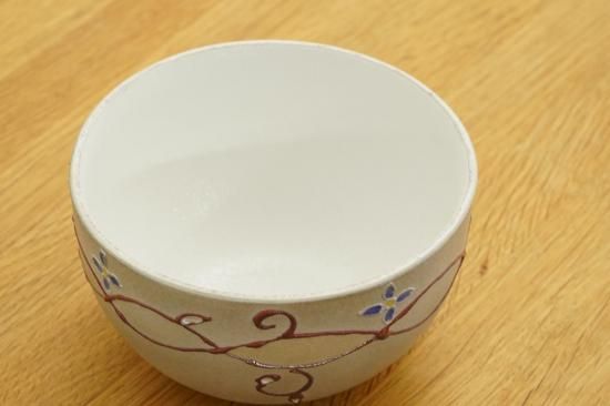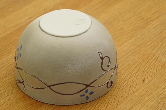 薄めのグレー地に描かれた更紗紋が印象的な、蓋物。