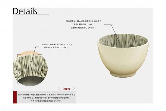皿の中央部分は円形の撥水印刷がしてあるため、十草の柄をうっすらと見せながらも、料理の盛り付けという機能性を持ち合わせ、デザイン性との両立を果たしています。
