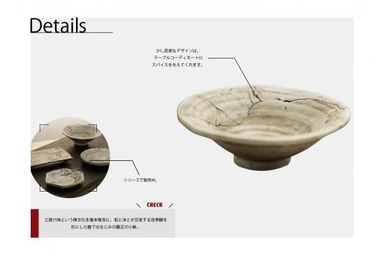 三徳六味の禅文化から継承された日本料理のコンセプト を忘れず大切にしながら、和・洋が複雑に交錯する現代の「食」の形態に対応したスタイルを器を通して表現しています。