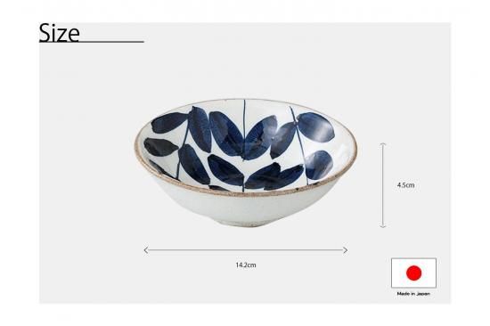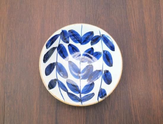 柔らかい粉引の上に、大胆に呉須で大きく描かれた紺色の若葉が印象的なうつわ。