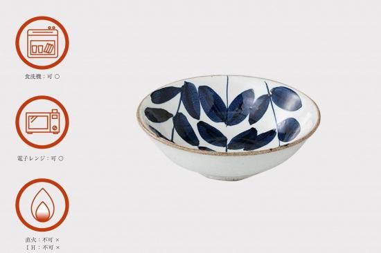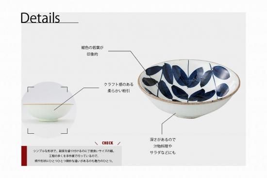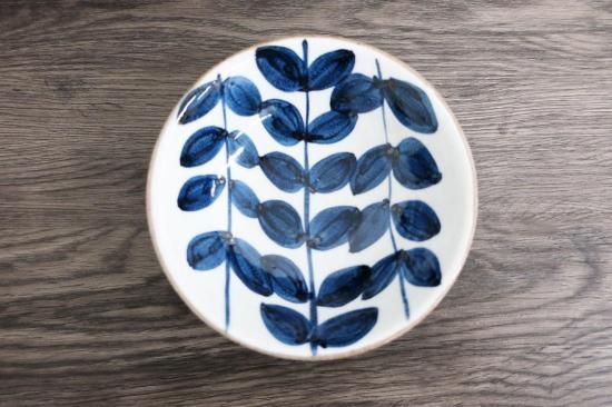 粉引釉の上に藍色で描かれたシンプルな若葉のデザインがおしゃれなシリーズです。