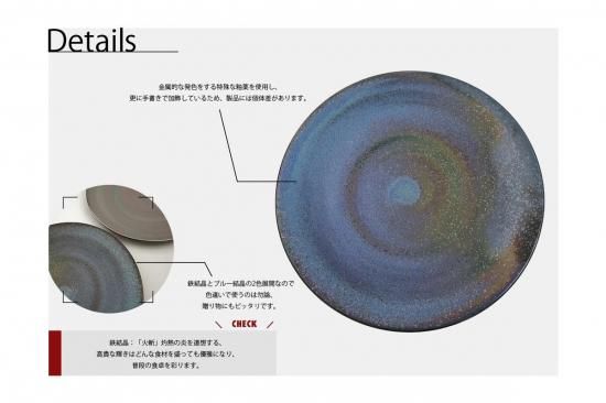 金属的な発色をする特殊な釉薬を使用し、更に手書きで加飾しているため、製品には個体差があります。
