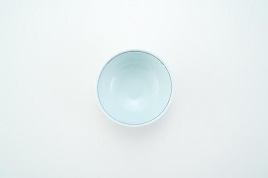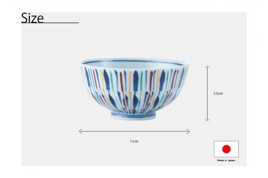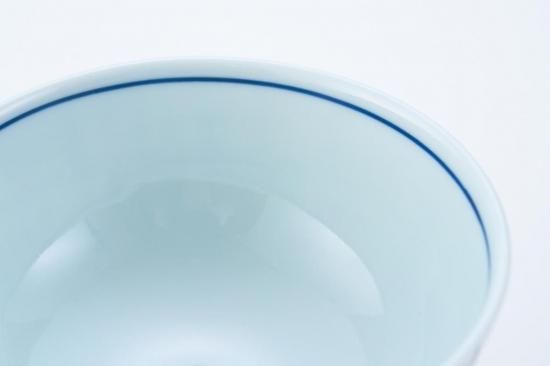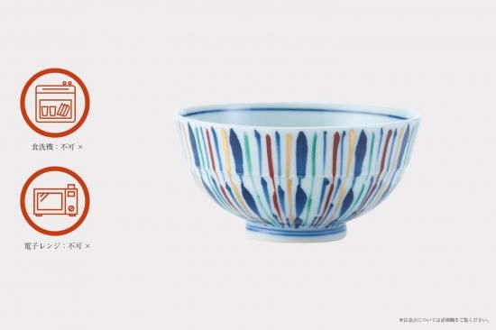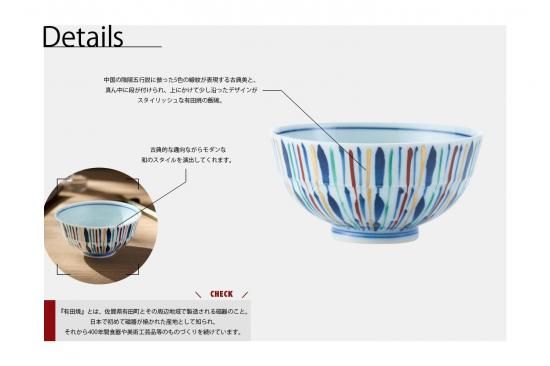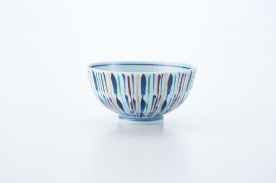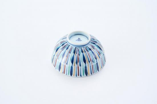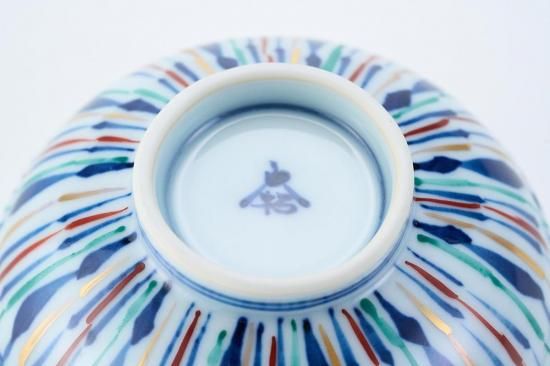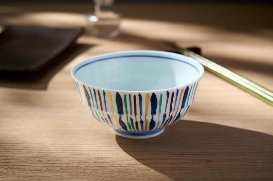 中国の陰陽五行説に倣った5色の線紋が表現する古典美と、真ん中に段が付けられ、上にかけて少し沿ったデザインがスタイリッシュな有田焼の飯碗。