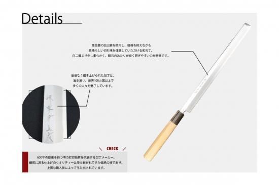 高品質の白三鋼を使用し、価格を抑えながも素晴らしい切れ味を体感していただける和包丁。白二鋼より少し柔らかく、砥石のあたりが良く研ぎやすいのが特徴です。