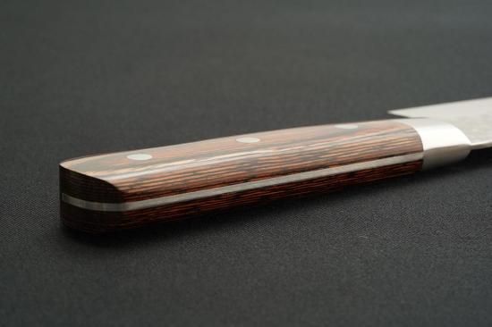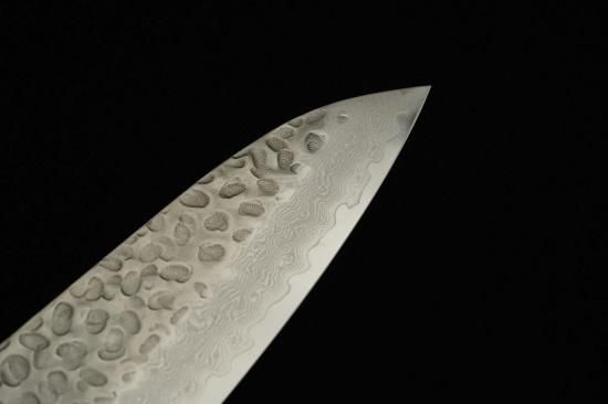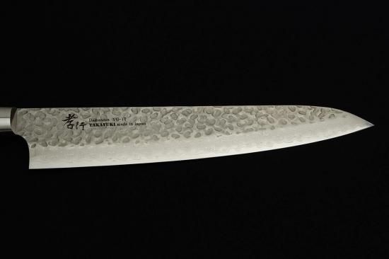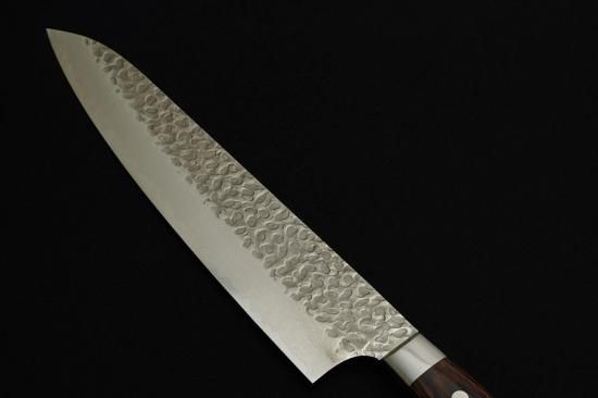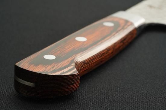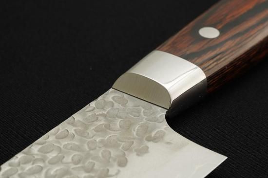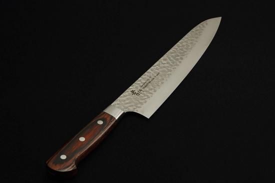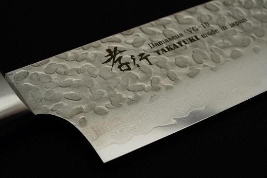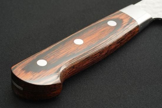 サビに強く切れ味鋭いVG-10を美しい紋様の槌目ダマスカス鋼に割り込ませた包丁です。